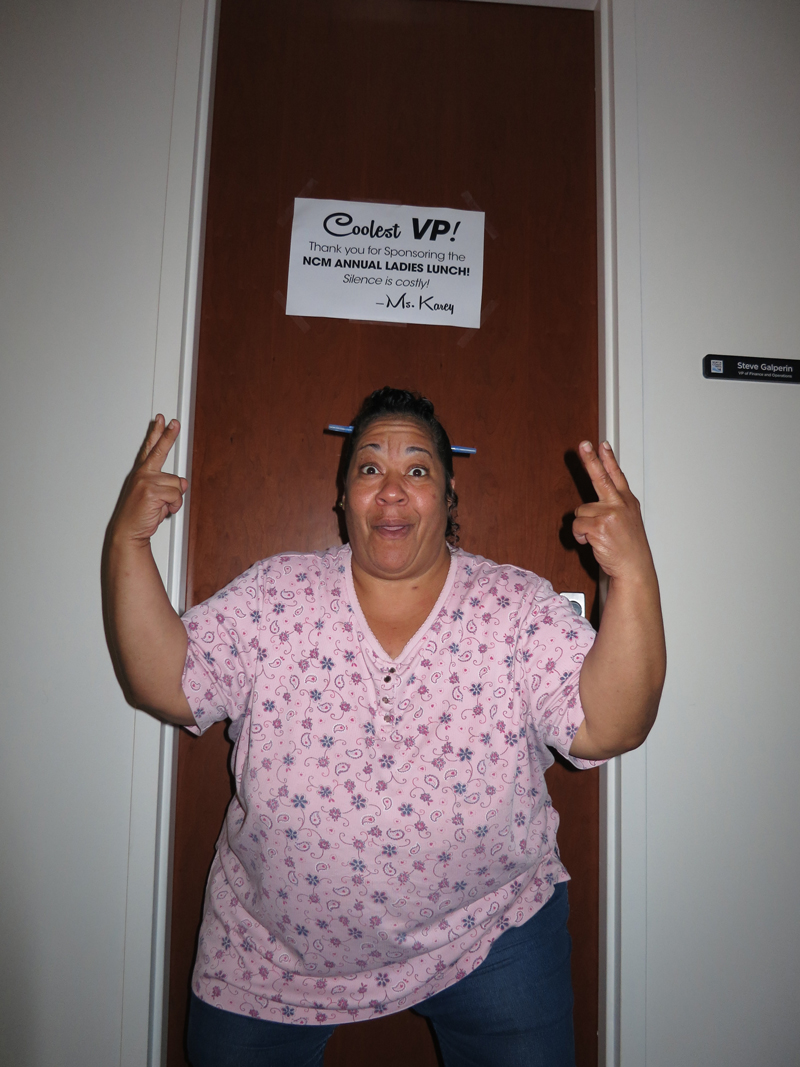 So NCM VP of finance and operations Steve Galperin made a bet with Karey recently. He bet her she couldn’t make it a week at work without talking. Everyone laughed because Karey HAS to talk, right?