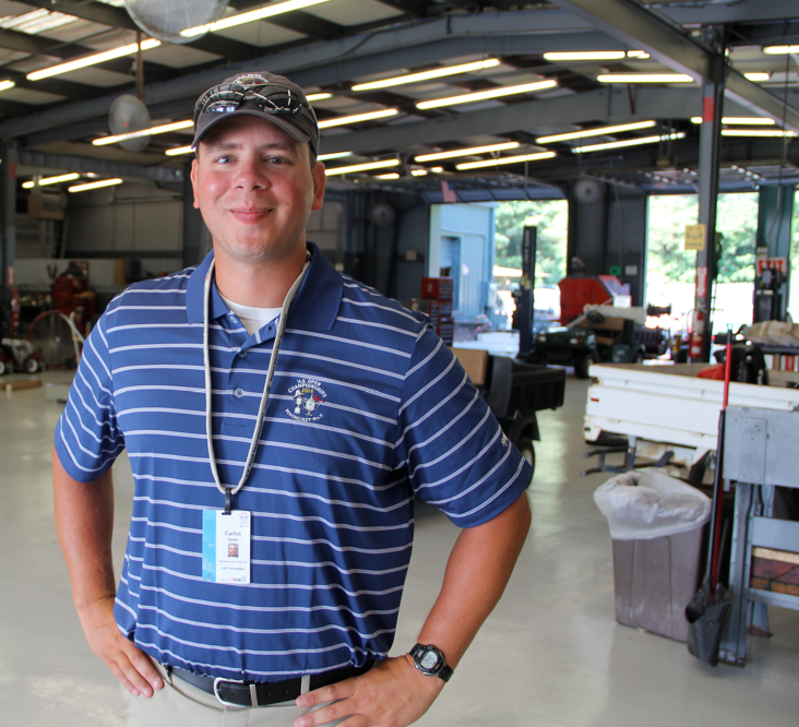 Carlos Sanes takes a quick break from work to smile for a photo in the Pinehurst maintenance building. Photo by: Seth Jones