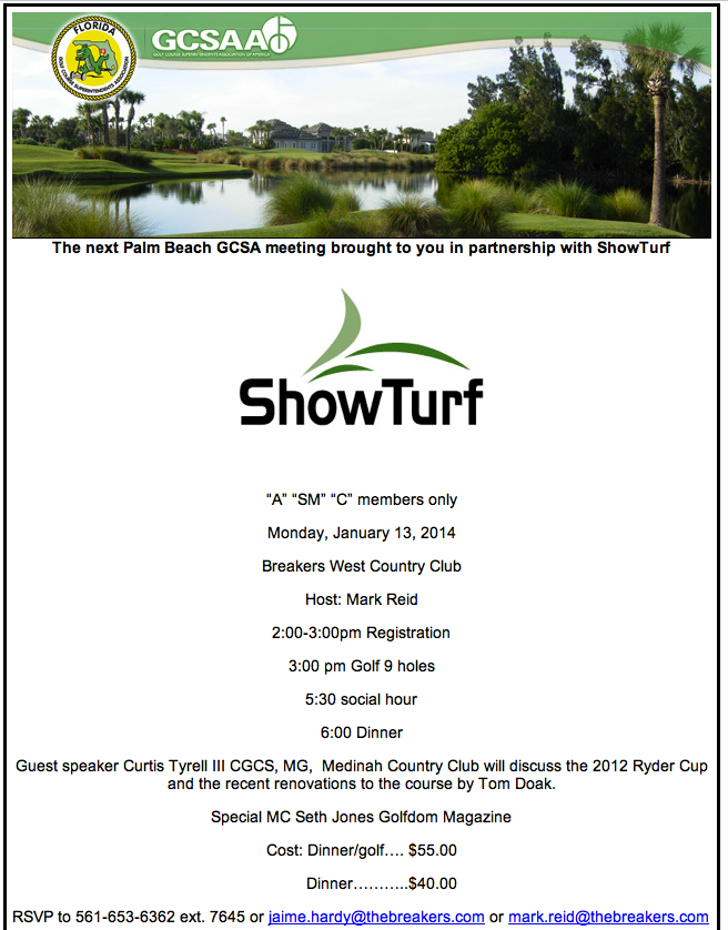 Come see me — and some guy named Curtis Tyrell, he hosted the Ryder Cup at Medinah and also spoke at the 2012 Golfdom Summit or something, I don’t know — at Monday’s Palm Beach GCSA meeting. The invitation is right… over… there —->
