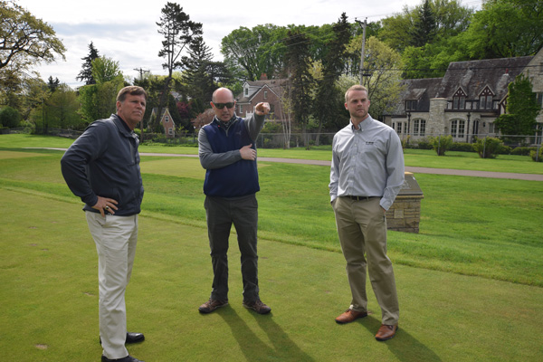 (L to R) BASF Technical Service Representative Kyle Miller, Schindele and BASF Sales Specialist Nathan Mezera tour Edina Country Club.
