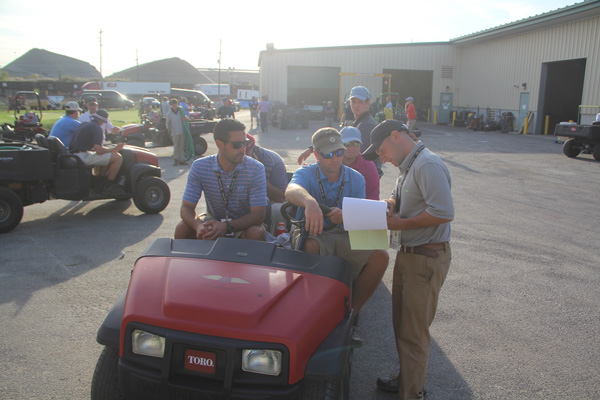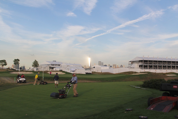 Liberty National Superintendent Greg James gives the maintenance team a pep talk, and the PGA Tour’s Paul Vermeulen says a prayer for the course.