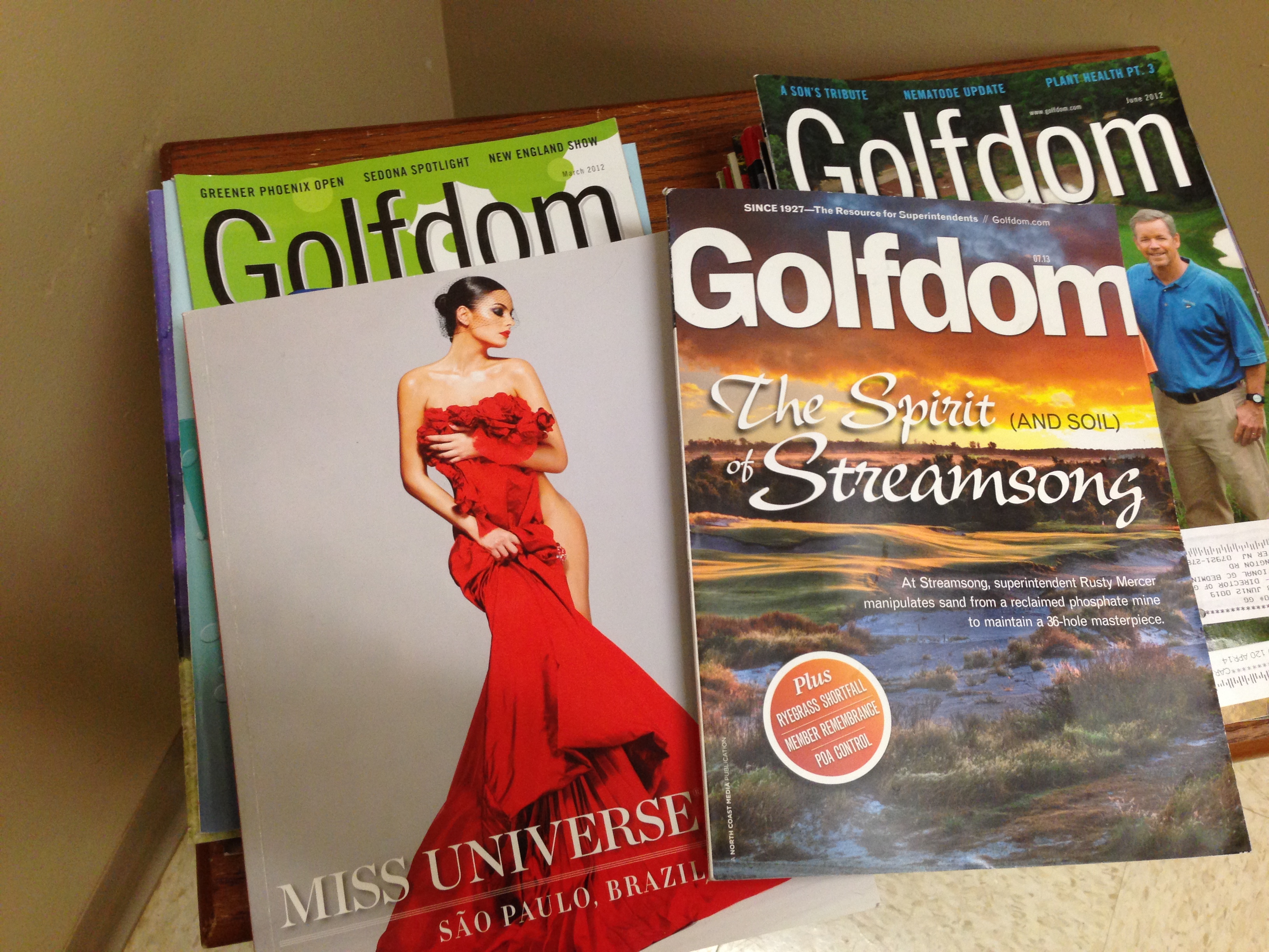 Here in the Golfdom editorial HQ, we’ve got a book called “Toilet Trivia,” an old Esquire, a beat up Spider-Man comic, and several back issues of our own magazine. We’re vain like that.