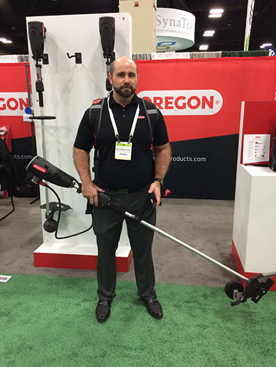 At GIS 2018, Oregon’s Joe Amalfitano demonstrated a backpack battery-powered trimmer, one of the many products of interest at the Summit.