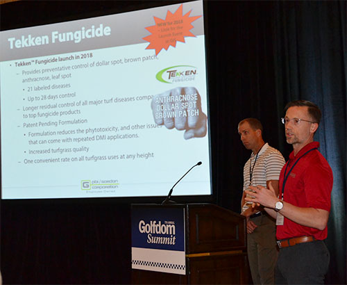 The company’s new Tekken broad-spectrum fungicide was frequently discussed, even though it wasn’t available at the time (it became available last month.) Goodrich was prepared, telling attendees that Tekkencontrols 21 problematic diseases, uses two modes of action, delivers control for up to 28 days and is applied at one rate for all turfgrasses, eliminating guesswork.